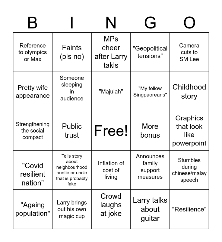This bingo card has a free space and 24 words: Tells story about neighbourhood auntie or uncle that is probably fake, Larry brings out his own magic cup, "Majulah", "Ageing population", Camera cuts to SM Lee, Reference to olympics or Max, Pretty wife appearance, Faints (pls no), More bonus, Inflation of cost of living, "My fellow Singpaoreans", Strengthening the social compact, Announces family support measures, Stumbles during chinese/malay speech, Someone sleeping in audience, Larry talks about guitar, Graphics that look like powerpoint, MPs cheer after Larry takls, Childhood story, Public trust, "Resilience", "Covid resilient nation", "Geopolitical tensions" and Crowd laughs at joke.