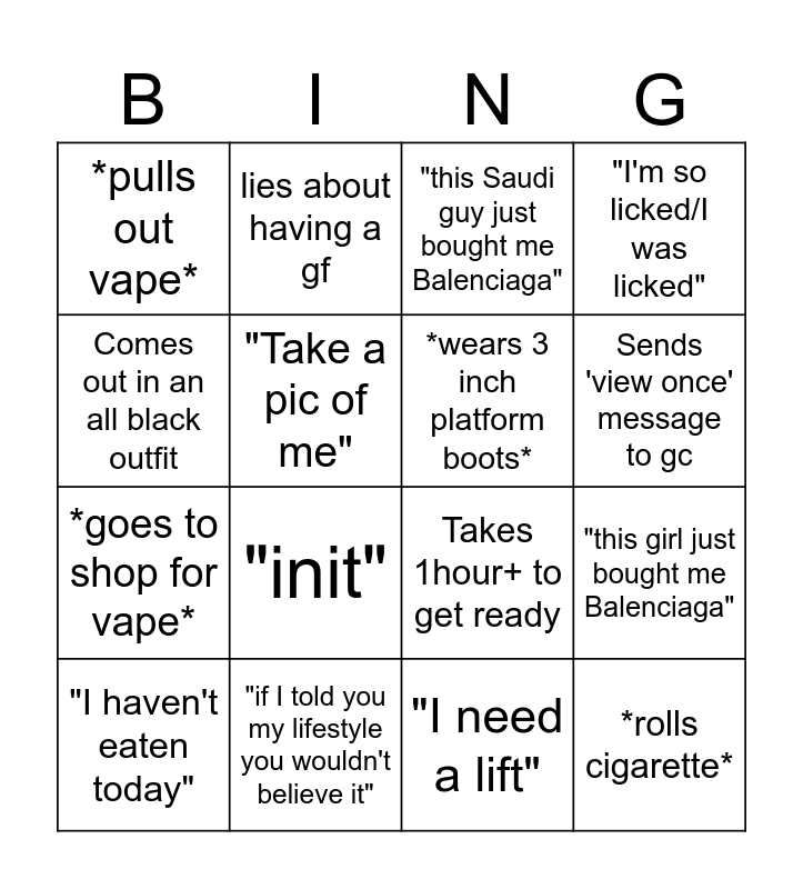 This bingo card has 16 words: "if I told you my lifestyle you wouldn't believe it", "this girl just bought me Balenciaga", "this Saudi guy just bought me Balenciaga", *pulls out vape*, *goes to shop for vape*, lies about having a gf, Takes 1hour+ to get ready, "I need a lift", Comes out in an all black outfit, "Take a pic of me", "I haven't eaten today", "I'm so licked/I was licked", "init", Sends 'view once' message to gc, *wears 3 inch platform boots* and *rolls cigarette*.