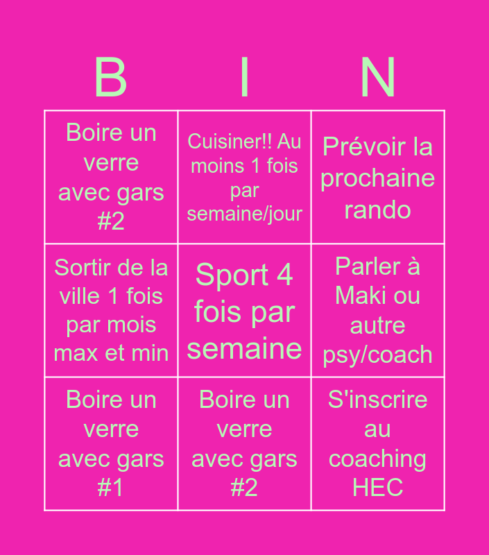 This bingo card has a free space and 9 words: Boire un verre avec gars #1, Prévoir la prochaine rando, Cuisiner!! Au moins 1 fois par semaine/jour, Sortir de la ville 1 fois par mois max et min, Boire un verre avec gars #2, Parler à Maki ou autre psy/coach, S'inscrire au coaching HEC, Se coiffer and Boire un verre avec gars #2.