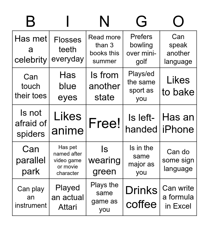 This bingo card has a free space and 24 words: Has pet named after video game or movie character, Played an actual Attari, Is from another state, Can play an instrument, Can speak another language, Has met a celebrity, Can touch their toes, Flosses teeth everyday, Is left-handed, Is wearing green, Plays/ed the same sport as you, Is not afraid of spiders, Is in the same major as you, Can do some sign language, Has blue eyes, Drinks coffee, Has an iPhone, Read more than 3 books this summer, Likes to bake, Likes anime, Can write a formula in Excel, Can parallel park, Prefers bowling over mini-golf and Plays the same game as you.