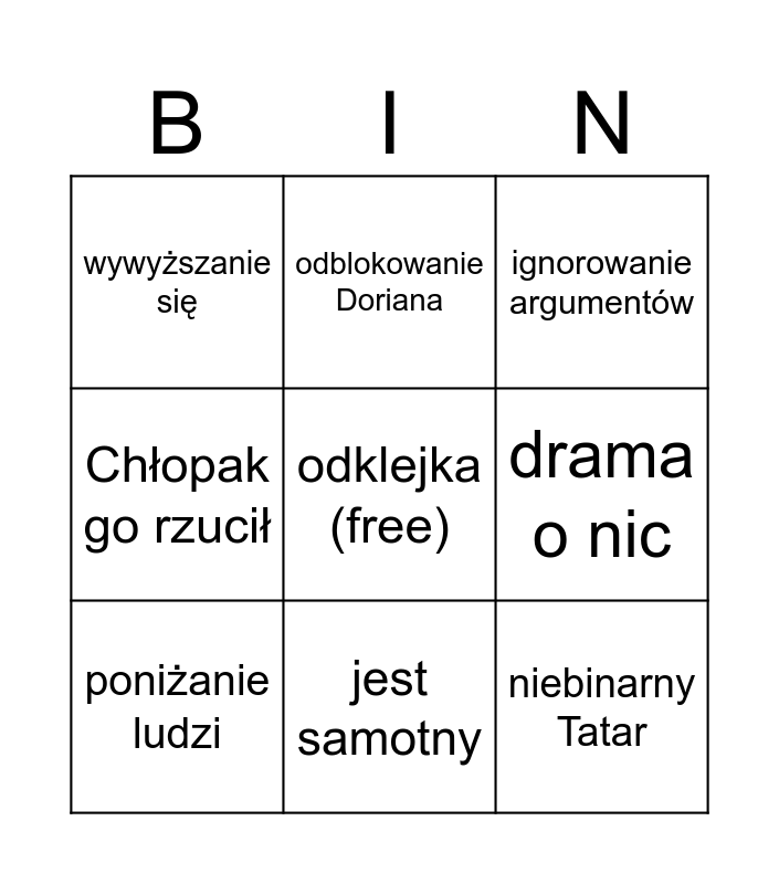 This bingo card has a free space and 8 words: drama o nic, ignorowanie argumentów, odblokowanie Doriana, poniżanie ludzi, wywyższanie się, niebinarny Tatar, Chłopak go rzucił and jest samotny.
