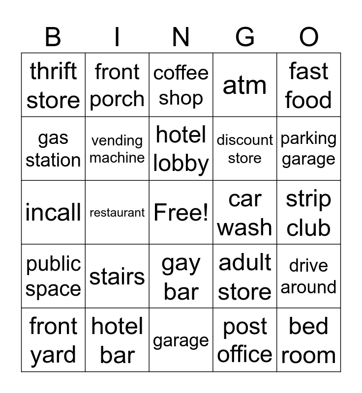 This bingo card has a free space and 50 words: living room, bed room, bathroom, garage, stairs, kitchen, front porch, back porch, gas station, public park, vending machine, atm, drive around, adult store, grocery store, dollar store, hotel lobby, car wash, drive thru, fast food, restaurant, post office, thrift store, discount store, downtown, rest area, parking garage, mall, coffee shop, gay bar, truck stop, bus, taxi, hotel pool, hotel bar, hotel room (His), hotel room (Yours), straight bar, retail store, strip club, dance club, his place, your place, back yard, front yard, incall, outcall, hotel, public space and streetwalking.