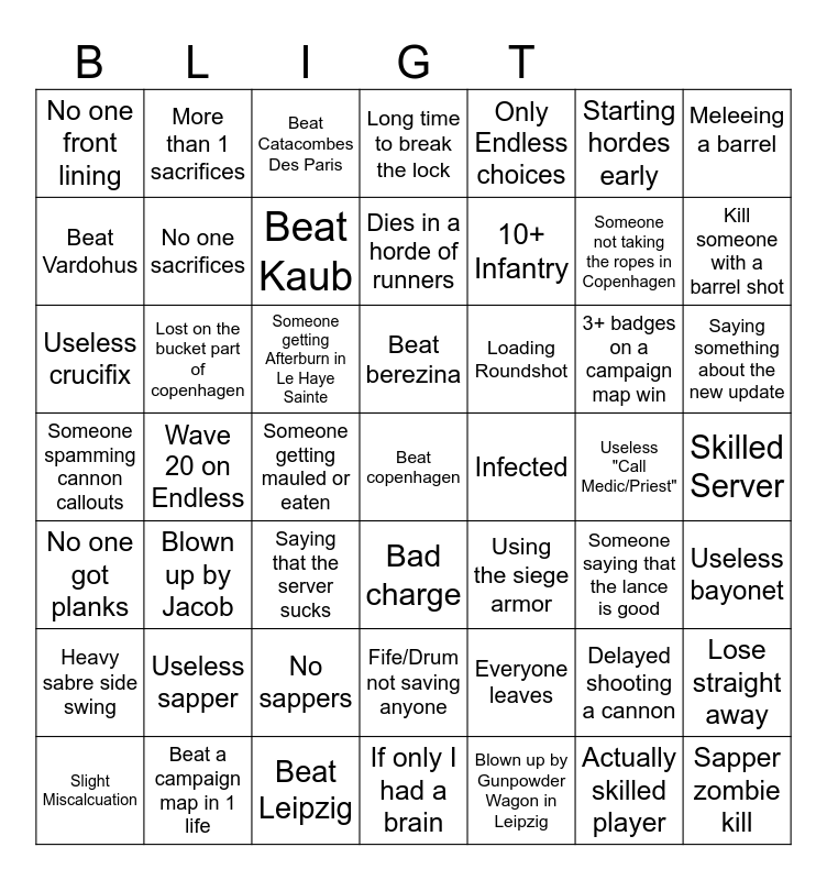 This bingo card has 50 words: Lose straight away, Someone not taking the ropes in Copenhagen, Actually skilled player, Wave 20 on Endless, Someone getting Afterburn in Le Haye Sainte, Bad charge, More than 1 sacrifices, If only I had a brain, Starting hordes early, Using the siege armor, Meleeing a barrel, Long time to break the lock, 3+ badges on a campaign map win, Loading Roundshot, No sappers, Skilled Server, Beat Vardohus, Kill someone with a barrel shot, Slight Miscalcuation, Only Endless choices, 10+ Infantry, Someone getting mauled or eaten, No one front lining, No one sacrifices, Beat a campaign map in 1 life, Beat copenhagen, Beat Kaub, Beat Leipzig, Beat Catacombes Des Paris, Beat berezina, Beat San Sebastian, No one got planks, Useless sapper, Fife/Drum not saving anyone, Someone spamming cannon callouts, Useless "Call Medic/Priest", Someone saying that the lance is good, Useless bayonet, Heavy sabre side swing, Useless crucifix, Saying that the server sucks, Everyone leaves, Blown up by Jacob, Blown up by Gunpowder Wagon in Leipzig, Saying something about the new update, Dies in a horde of runners, Infected, Delayed shooting a cannon, Lost on the bucket part of copenhagen and Sapper zombie kill.