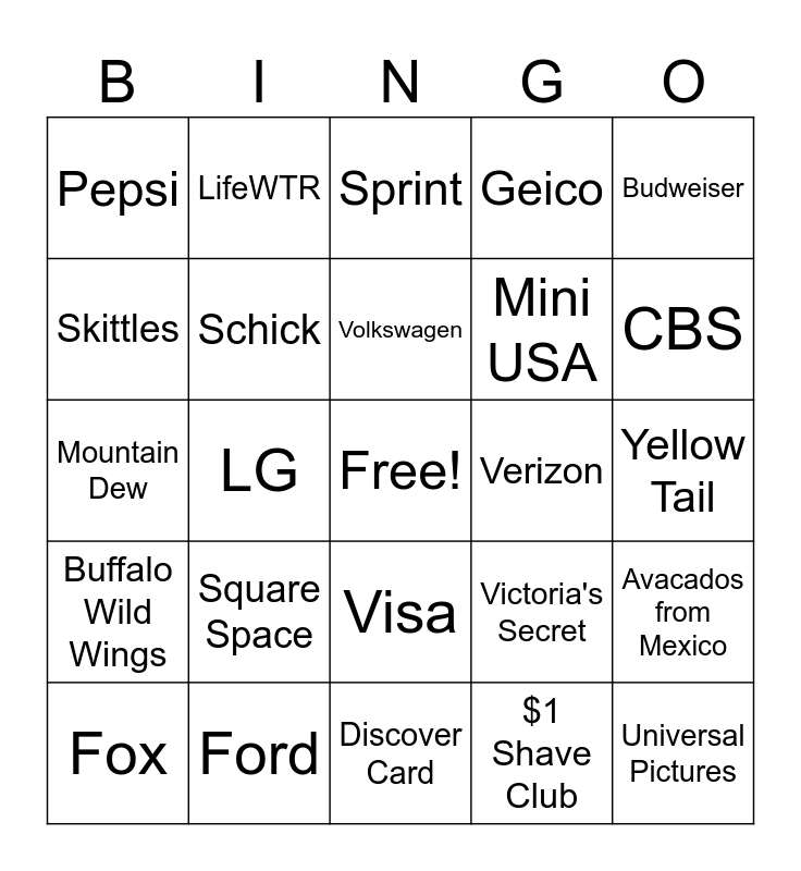This bingo card has a free space and 24 words: Square Space, Ford, Volkswagen, Fox, Budweiser, Pepsi, Skittles, LifeWTR, Verizon, Visa, Mini USA, Mountain Dew, Victoria's Secret, Avacados from Mexico, Schick, $1 Shave Club, Yellow Tail, Sprint, CBS, LG, Universal Pictures, Buffalo Wild Wings, Geico and Discover Card.