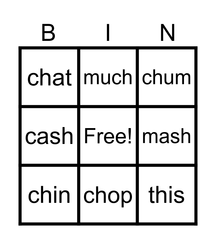 This bingo card has a free space and 25 words: chin, chap, chips, rich, chop, chum, chat, much, fish, shop, dish, wish, ship, hush, rush, shed, rash, mash, cash, dash, shell, shot, shut, this and that.
