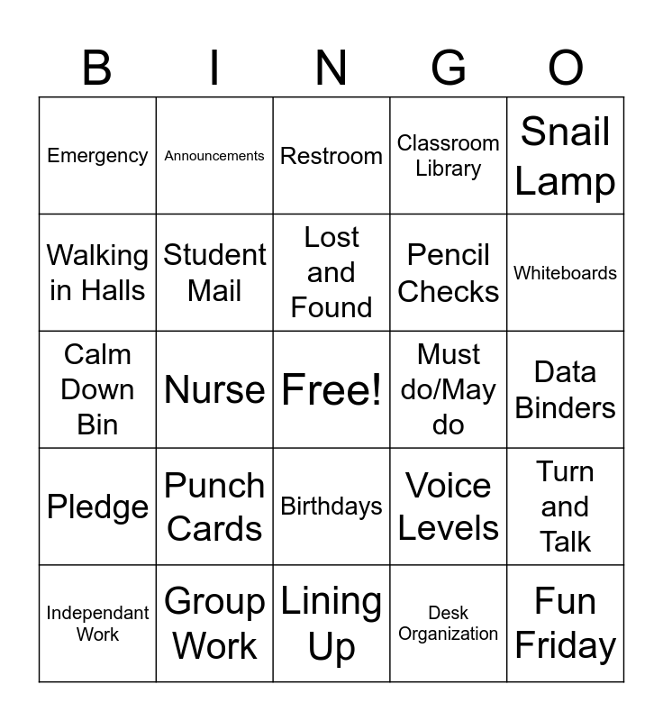 This bingo card has a free space and 27 words: Voice Levels, Entering Room, Pencil Checks, Lining Up, Walking in Halls, Restroom, Announcements, Pledge, Must do/May do, Turn and Talk, Calm Down Bin, Classroom Library, Independant Work, Group Work, Whiteboards, Teacher Mail, Student Mail, Lost and Found, Punch Cards, Emergency, Data Binders, Desk Organization, Nurse, Fun Friday, Birthdays, Snail Lamp and Packing Up.