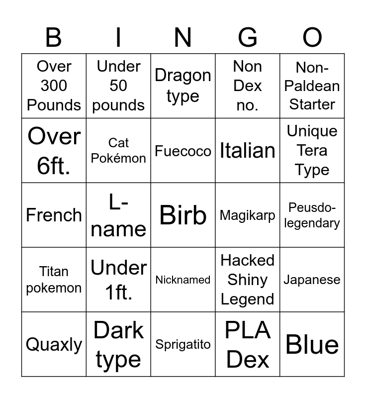 This bingo card has 25 words: Under 1ft., Sprigatito, Fuecoco, Quaxly, Non-Paldean Starter, Over 300 Pounds, Over 6ft., Under 50 pounds, Magikarp, Nicknamed, Italian, French, Hacked Shiny Legend, Japanese, Cat Pokémon, Blue, Peusdo-legendary, Dragon type, Unique Tera Type, L-name, Birb, Dark type, Titan pokemon, Non Dex no. and PLA Dex.