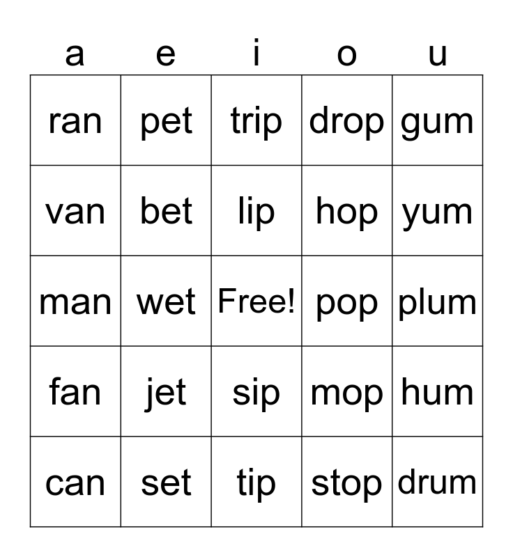 This bingo card has a free space and 24 words: can, jet, lip, stop, gum, ran, pet, trip, pop, plum, man, bet, mop, hum, van, set, tip, drop, yum, fan, wet, sip, hop and drum.