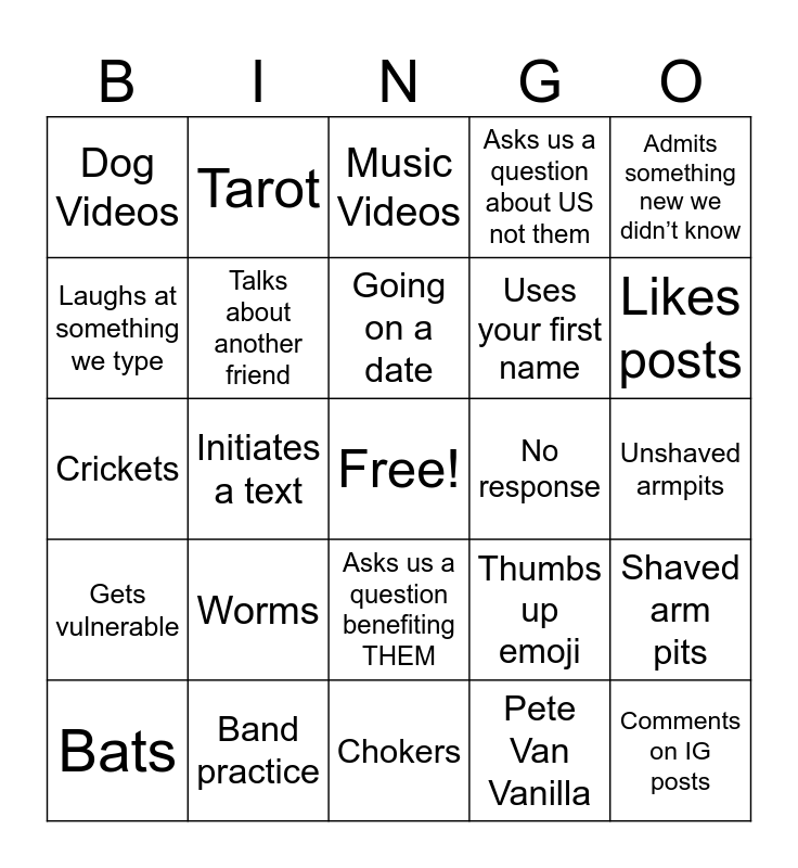 This bingo card has a free space and 24 words: Bats, Worms, Going on a date, Pete Van Vanilla, Admits something new we didn’t know, Dog Videos, Tarot, Music Videos, No response, Unshaved armpits, Crickets, Talks about another friend, Thumbs up emoji, Shaved arm pits, Laughs at something we type, Band practice, Chokers, Asks us a question about US not them, Likes posts, Gets vulnerable, Initiates a text, Asks us a question benefiting THEM, Uses your first name and Comments on IG posts.