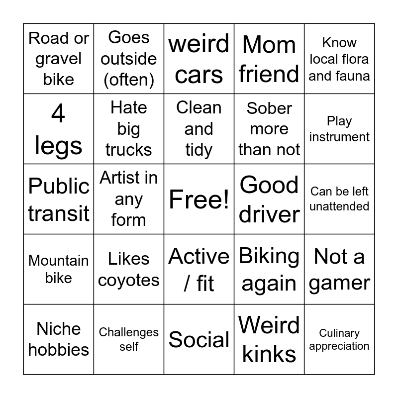 This bingo card has a free space and 24 words: Likes coyotes, Challenges self, Clean and tidy, Niche hobbies, Know local flora and fauna, Road or gravel bike, 4 legs, Goes outside (often), Good driver, Active / fit, Sober more than not, Public transit, Biking again, Not a gamer, Hate big trucks, Weird kinks, Can be left unattended, weird cars, Play instrument, Artist in any form, Culinary appreciation, Mountain bike, Mom friend and Social.
