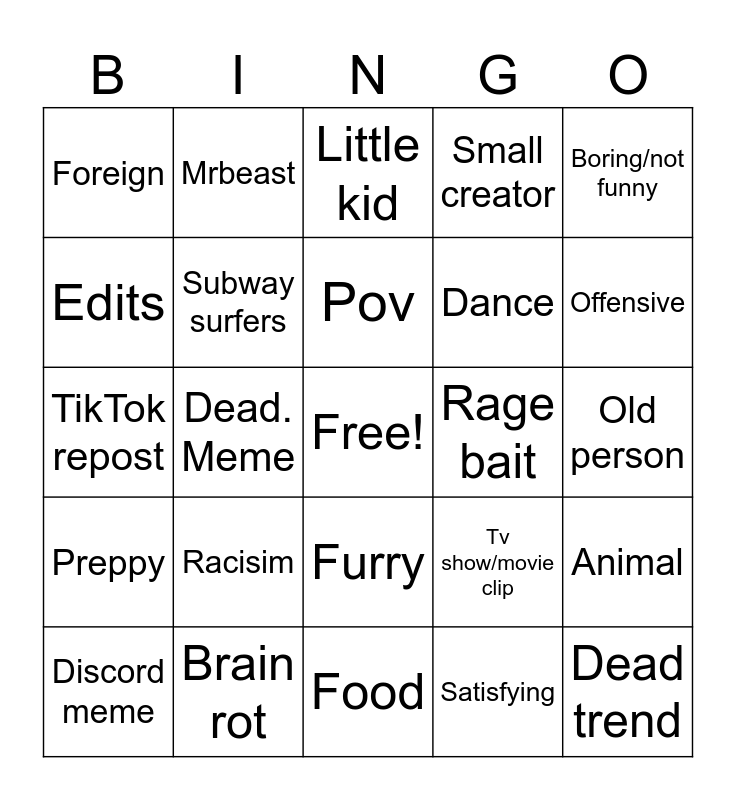 This bingo card has a free space and 24 words: Racisim, Brain rot, Pov, Discord meme, Boring/not funny, Foreign, Edits, Mrbeast, Rage bait, Furry, Dance, TikTok repost, Tv show/movie clip, Animal, Subway surfers, Satisfying, Old person, Little kid, Offensive, Dead. Meme, Dead trend, Preppy, Small creator and Food.