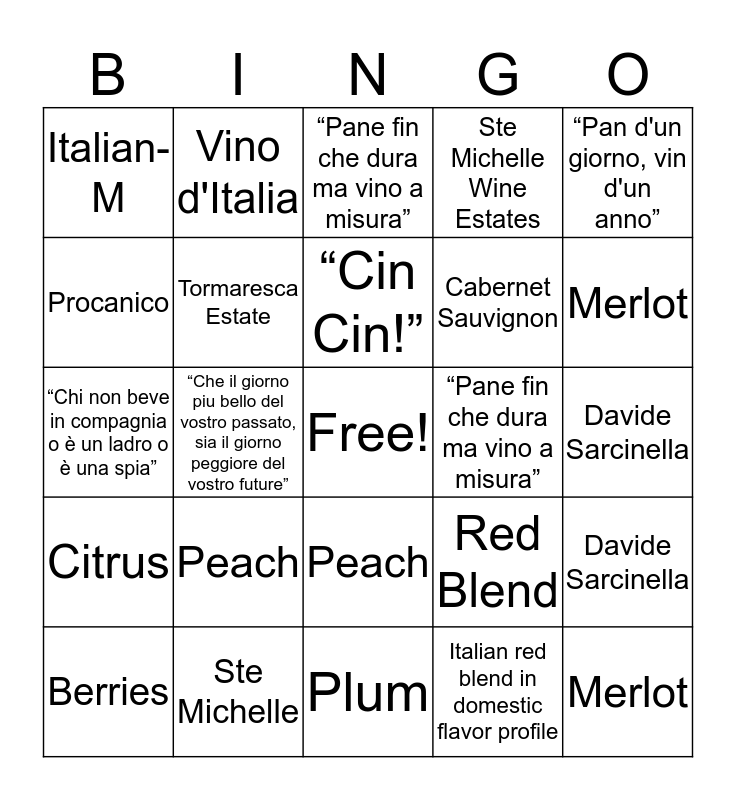 ⚠ This card has duplicate items: Cabernet Sauvignon (3), Merlot (2), Berries (2), Plum (2), Peach (2), Citrus (2), Vino d'Italia (2), Grechetto (2), Procanico (2), Mamma Mia! (2), Davide Sarcinella (2), Red Blend (2), White Blend (2), “Salute!” (2), “Cin Cin!” (2), “Pane fin che dura ma vino a misura” (2), “Chi non beve in compagnia o è un ladro o è una spia” (2), “Pan d'un giorno, vin d'un anno” (2), “Che il giorno piu bello del vostro passato, sia il giorno peggiore del vostro future” (2)