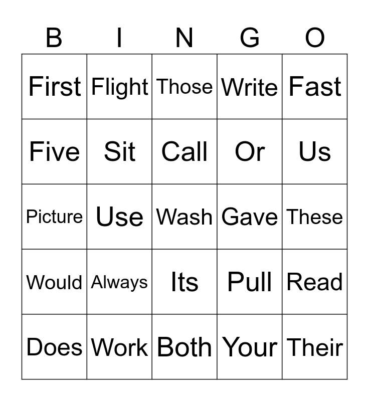 This bingo card has 25 words: Always, Both, Call, Does, Fast, First, Five, Flight, Gave, Its, Or, Picture, Pull, Read, Sit, Their, These, Those, Us, Use, Wash, Work, Would, Write and Your.