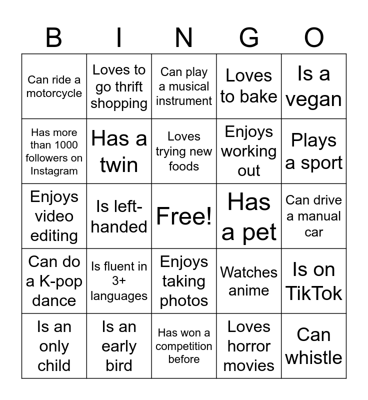 This bingo card has a free space and 26 words: Enjoys taking photos, Loves horror movies, Loves trying new foods, Is an early bird, Is a vegan, Can ride a motorcycle, Has more than 1000 followers on Instagram, Loves to go thrift shopping, Can drive a manual car, Watches anime, Enjoys working out, Enjoys video editing, Is on TikTok, Is an only child, Is left-handed, Has a green thumb, Loves to bake, Can do a K-pop dance, Can play a musical instrument, Can whistle, Plays a sport, Has won a competition before, Has a pet, Is fluent in 3+ languages, Has a twin and Has traveled solo.