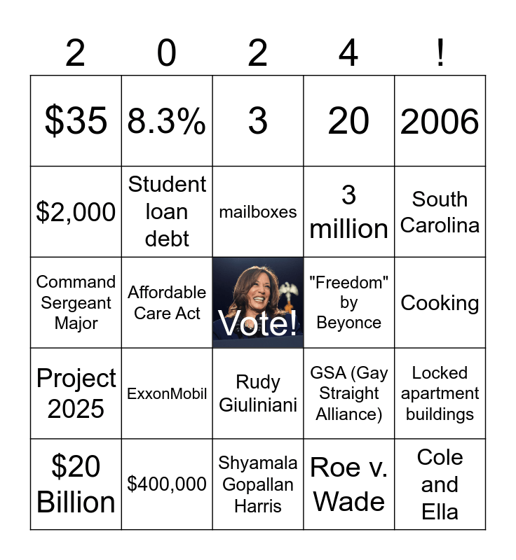 This bingo card has a free space and 29 words: $20 Billion, Inflation Reduction Act, Affordable Care Act, Rural electrification, $35, 3, Student loan debt, ExxonMobil, "Freedom" by Beyonce, $400,000, Cooking, Cole and Ella, Shyamala Gopallan Harris, Roe v. Wade, South Carolina, Arizona, Rudy Giuliniani, Project 2025, 2006, Command Sergeant Major, GSA (Gay Straight Alliance), Child Tax Credit, 3 million, $2,000, 20, 8.3%, Locked apartment buildings, mailboxes and "We win!".