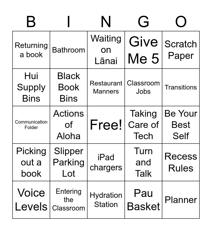 This bingo card has a free space and 34 words: Name Tags, Lunch Count, Mood Meter, Community Charter, Be Your Best Self, Hui Supply Bins, Black Book Bins, Hydration Station, Classroom Jobs, Planner, Communication Folder, Bathroom, Pau Basket, Putting Name & # on paper, Picking out a book, Actions of Aloha, iPad chargers, Taking Care of Tech, Recess Rules, Voice Levels, Entering the Classroom, Packing Up to Go Home, Give Me 5, Transitions, Lei Mānoa Oli, Slipper Parking Lot, Waiting on Lānai, Stay On Course, Scratch Paper, Returning a book, Before School, Restaurant Manners, Turn and Talk and Speak Like a "Scholar".