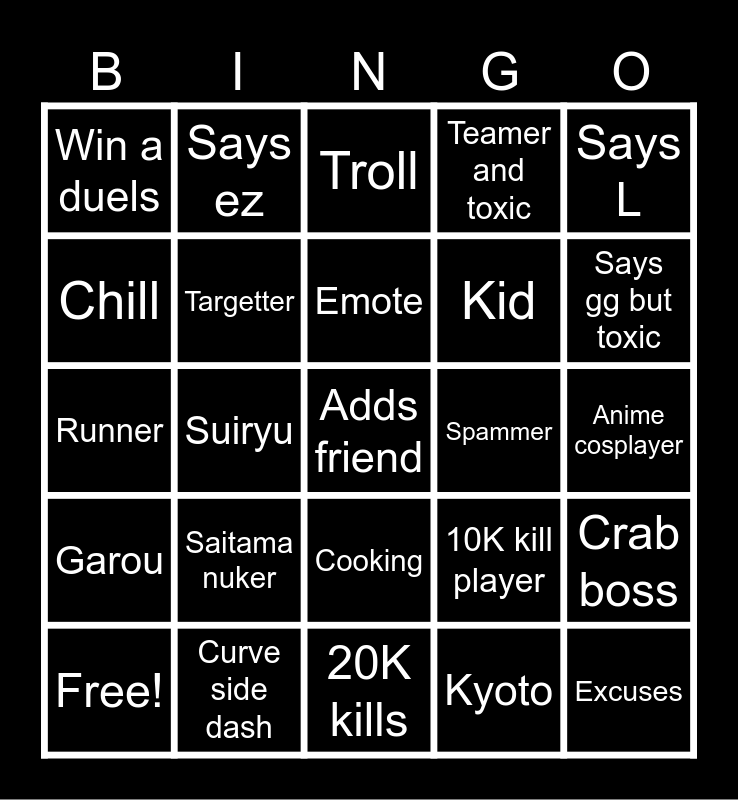 This bingo card has 25 words: Saitama nuker, 20K kills, Emote, Free!, Says L, Win a duels, Chill, Says ez, Spammer, Cooking, Kid, Runner, 10K kill player, Crab boss, Targetter, Excuses, Anime cosplayer, Troll, Says gg but toxic, Suiryu, Adds friend, Curve side dash, Garou, Teamer and toxic and Kyoto.