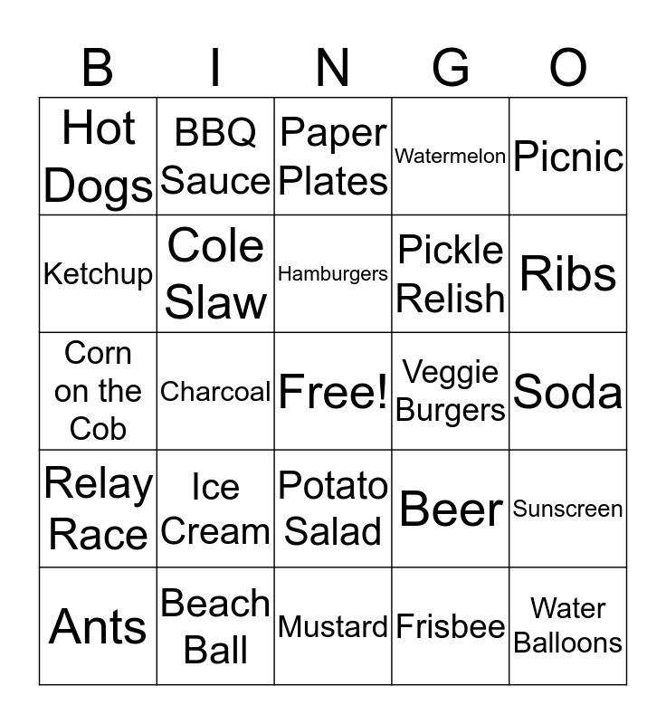 This bingo card has a free space and 24 words: Ice Cream, Beach Ball, Hamburgers, Ants, Picnic, Hot Dogs, Ketchup, BBQ Sauce, Veggie Burgers, Potato Salad, Pickle Relish, Corn on the Cob, Beer, Sunscreen, Cole Slaw, Frisbee, Soda, Paper Plates, Ribs, Charcoal, Water Balloons, Relay Race, Watermelon and Mustard.