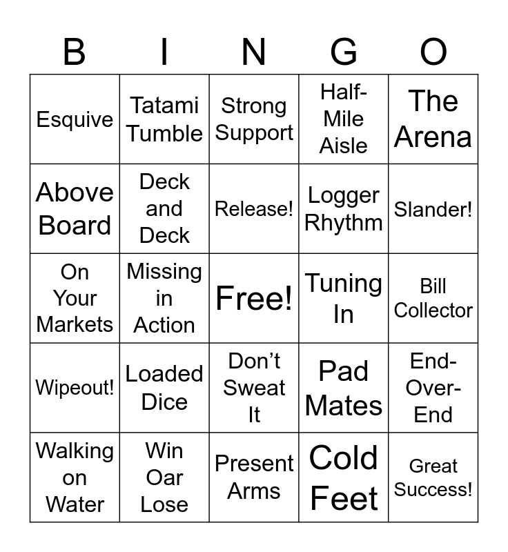 This bingo card has a free space and 207 words: Starlit Ceremony, Blue Barons, Green Gladiators, Gold Stars, Orange Optimists, Pink Pioneers, Red Respect, Final Countdown, The Games Begin, Tatami Tumble, Sporting Conduct, Smashing Success, Ouch!, Crushed Ice, Hawk-Eyed, Dual Flurry, Self-Protection, Top Chops, Day in the Bay, Double Scull Duo, Knot Bad, Tight Crew, No Bowing Out, Flare for Drama, Win Oar Lose, Deck and Deck, Rowed to Victory, Long Course, Pool Deck, Warm Up, No Splash Zone, Well Suited, Dive In, Freestylin’, The Approach, Winning Touch, Full House, Priming Up, Game Plan, Tip-Off, Pass Back, Fending off, Nice Try!, Murderball Cup, Pink and Gold, Highland Games, Above Board, Lofty Perch, Limber Timber, Heave!, Caber Neighbors, Logger Rhythm, End-Over-End, Woodland Winners, Track and Field, Chowing Down, Disqualified!, Release!, Hammer Time, Take Aim, Stick the Landing, Discobolos, Dream Team, Firing Range, Ammo Cash, Safety First, Ready, Aim!, Spend!, Precision Vision, On the Money, Bill Collector, Deadeye Duo, Armor Up, Show Time, Field Day, Shall Not Pass, Slander!, Hi-Jink, Huge Savings, Slapshot, Best in Field, Ramped Excitement, Pad Mates, Lazy Daisy, Daily Grind, Boarder Collie, Lip Smacking, Stair Master, Cool Cat, Underdogs, Set the Stage, In Tandem, Ringing True, Beam Me Up!, Razzle Dazzle, Ribbon Dance, Wishful Thinking, Perfect Dismount, Victory Podium, Loaded Dice, Lying in Weight, Strong Support, Hold It!, Powerful Aura, Easy-Peasy, Center Stage, Strong Numbers, Worth It, Basic Training, The Tortoise, The Hare, Squeaky Clean, Pumped Up!, Track Meet, Calamity!, Engine That Could, Wins The Race!, The Arena, Old Faithful, Making Gains, Good Sports, Pink’s Serve, Locked In, Lucky Shot, A Net Win, The Money Pit, Shack Things Up, Hi, Divers!, Vertigo, Sync and Swim, Cold Feet, Pair of Jacks, Don’t Look Down, Party Time!, Paddle Pals, Bright and Early, Compound Interest, Precision Pros, Tuning In, Positions!, On The Draw, Well Taut, Arrow-Dynamic, Double Bullseye, The Big Day, Don’t Sweat It, Wax Poetic, Pipe Dreams, Surf’s Up!, Crushed It, Wipeout!, Tubular, Walking on Water, Parking Prix, Ready to Roll, Tune-Up, Hello You, Right Angle, Gearing Up, Park Place, Mind The Gap, Parking Ace, The Circuit, Quad Strength, Over-Tired, Missing in Action, Rearing To Go, On My Mark!, Barrowing Forward, Sabotage!, Wheel Win, A Day Out, Monarch of the Sea, Ace in the Hole, Dapper Fellows, Robo-Flock, Duck and Cover, Mine? Mine?, Quack-ing!, Great Success!, Take Me Out, Play Ball, Glovin’ It, For The Home Team, Throwing Heat, Crack of the Bat, Let It Slide, Home Sweet Home, Game, Set, Catch, Prestigious Piste, Sabre Stars, Present Arms, Salut Des Armes, Esquive, Touch!, Prime Victory, Blade Brilliance, En Garde Gold, Half-Mile Aisle, Proper Shopper, Track & Trolly, On Your Markets, Aisle Athletes, Bursting Buggy, Can-Do Attitude, Weight-In Win and Cart Dash Champs.