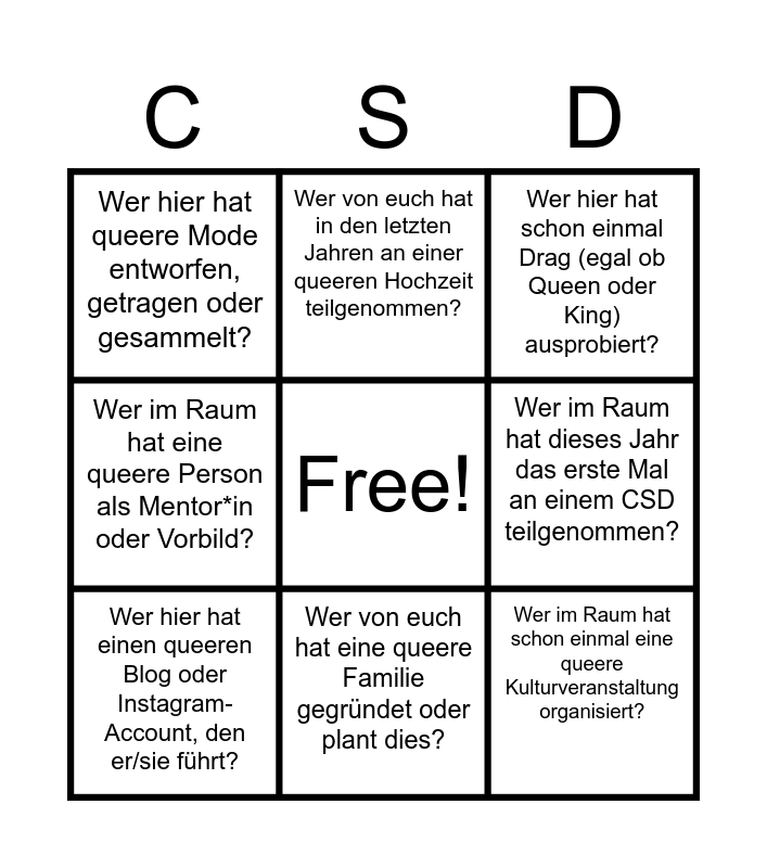 This bingo card has a free space and 8 words: Wer im Raum hat dieses Jahr das erste Mal an einem CSD teilgenommen?, Wer hier hat schon einmal Drag (egal ob Queen oder King) ausprobiert?, Wer von euch hat in den letzten Jahren an einer queeren Hochzeit teilgenommen?, Wer hier hat einen queeren Blog oder Instagram-Account, den er/sie führt?, Wer hier hat queere Mode entworfen, getragen oder gesammelt?, Wer im Raum hat schon einmal eine queere Kulturveranstaltung organisiert?, Wer im Raum hat eine queere Person als Mentor*in oder Vorbild? and Wer von euch hat eine queere Familie gegründet oder plant dies?.