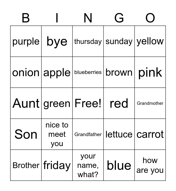 This bingo card has a free space and 52 words: hello, how are you, my name is..., your name, what?, nice to meet you, good/thank you, bye, tomato, onion, corn, apple, strawberry, carrot, lettuce, watermelon, grapes, blueberries, red, orange, yellow, green, blue, purple, brown, tan, gray, black, white, pink, my favorite color, your favorite color, what?, sunday, monday, tuesday, wednesday, thursday, friday, saturday, Family, Mother/Mom, Father/Dad, Grandmother, Son, Daughter, Grandfather, Niece, Nephew, Aunt, Uncle, Sister, Brother and Cousin.