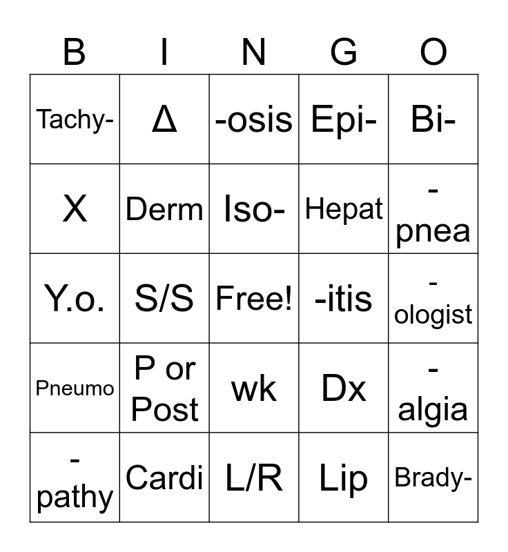 This bingo card has a free space and 58 words: Arthr, Cardi, Hydro, Pneumo, Lip, Osteo, Derm, Entero, Hepat, Crani, Epi-, Hyper-, Hypo-, Retro-, Trans-, Tachy-, Brady-, Bi-, A-, Iso-, -itis, -osis, -pathy, -algia, -trophy, -ologist, -ology, -cyte, -pnea, -emia, MOI, C/C, c/o, w/, ATR, Pt., Pn!, S/S, Y.o., A or Ant, P or Post, DDx, Dx, ATC, MMT (And the 1-5)), Prn, UFN, wk, L/R, Rx, b.i.d./t.i.d., Tx, Hx, Healthcare professions, Δ, ~, X and ∅.