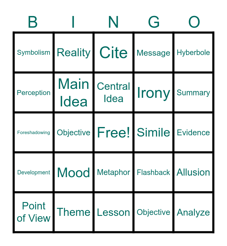 This bingo card has a free space and 24 words: Mood, Theme, Central Idea, Point of View, Hyberbole, Symbolism, Perception, Reality, Simile, Metaphor, Irony, Foreshadowing, Flashback, Allusion, Main Idea, Objective, Evidence, Cite, Summary, Objective, Analyze, Development, Message and Lesson.