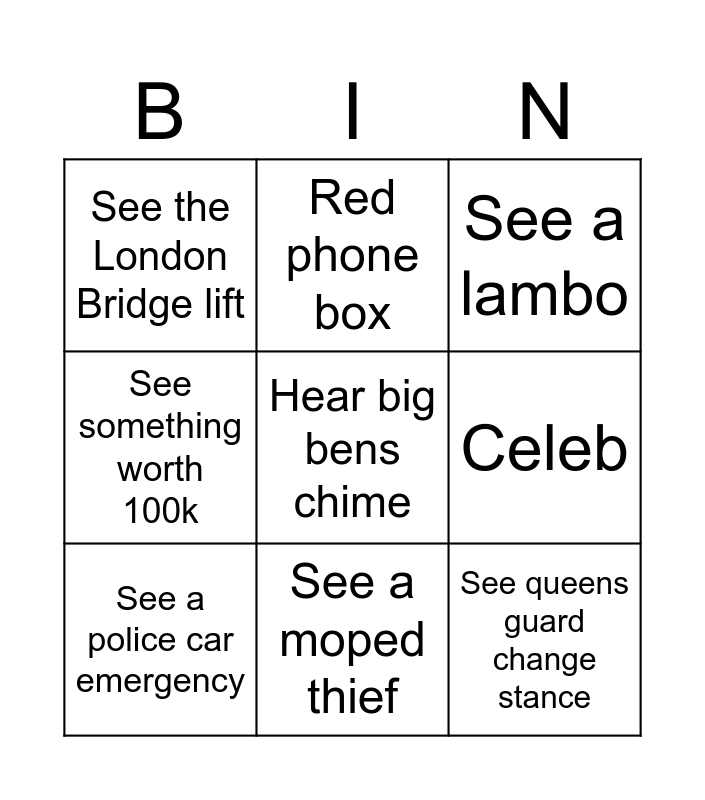 This bingo card has a free space and 8 words: Celeb, See a lambo, Red phone box, See a police car emergency, See the London Bridge lift, See queens guard change stance, See something worth 100k and See a moped thief.