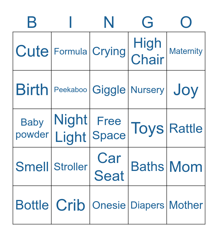 This bingo card has a free space and 44 words: Baby, Mother, Pacifier, Bottle, Parent, Diapers, Crying, Baby Lotion, Maternity, Crib, High Chair, Toys, Car Seat, Stroller, Blanket, Onesie, Bib, Baby powder, Milk, Joy, Formula, Lullaby, Cradle, Cute, Nap, Rattle, Wipes, Newborn, Baths, Smell, Snuggle, Mom, Socks, Monitor, Night Light, Drool, Crawling, Feeding, Giggle, Birth, Nursery, Playpen, Peekaboo and Bump.