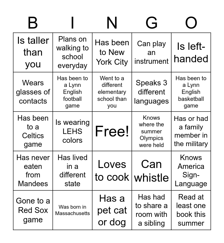 This bingo card has a free space and 56 words: Has lived in a city other than Lynn, Gone to a Red Sox game, Has at least 2 siblings, Is taller than you, Has a pet cat or dog, Prefers Wendys over McDonalds, Has been to a Lynn English football game, Loves rollercoasters, Speaks 3 different languages, Has a birthday in August, Can play an instrument, Plays a sport, Went to a different middle school than you, Can the name the principle of LEHS, Can tell you a knock-knock joke, Has met someone famous, Is left-handed, Is wearing LEHS colors, Has a job, Read at least one book this summer, Knows where the summer Olympics were held, Knows the address of LEHS, Can whistle, Has been to New York City, Has travelled to another country, Went to a different elementary school than you, Has been to multiple concerts, History is their favorite subject, Has been to a Lynn English basketball game, Went to the movies theater at least once this summer, Had a sibling attend LEHS, Does not own an iphone, Has been in a play, Has been to New Hampshire, Has or had a family member in the military, Wears glasses of contacts, Has been to a Celtics game, Is shorter than you, Has never eaten from Mandees, Plans on walking to school everyday, Loves to cook, Has been to Disney, Likes to eat sushi, Is learning English, Knows the name of our school mascot, Has lived in a different state, Was born in Massachusetts, Has a June birthday, Favorite subject is math, Can name a Taylor Swift song, Has had to share a room with a sibling, Is an only child, Has family living in another country, Does not like to play video games, Knows America Sign-Language and Has a parent that graduated from LEHS.