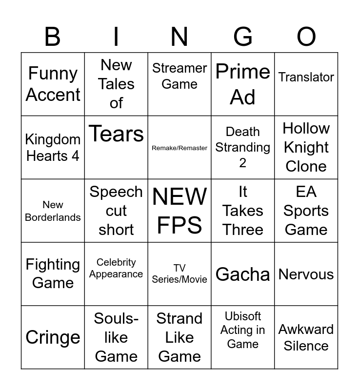 This bingo card has a free space and 24 words: Celebrity Appearance, Souls-like Game, Remake/Remaster, Cringe, Translator, Funny Accent, Kingdom Hearts 4, New Tales of, It Takes Three, TV Series/Movie, Death Stranding 2, New Borderlands, Gacha, Nervous, Tears, Ubisoft Acting in Game, EA Sports Game, Streamer Game, Hollow Knight Clone, Speech cut short, Awkward Silence, Fighting Game, Prime Ad and Strand Like Game.