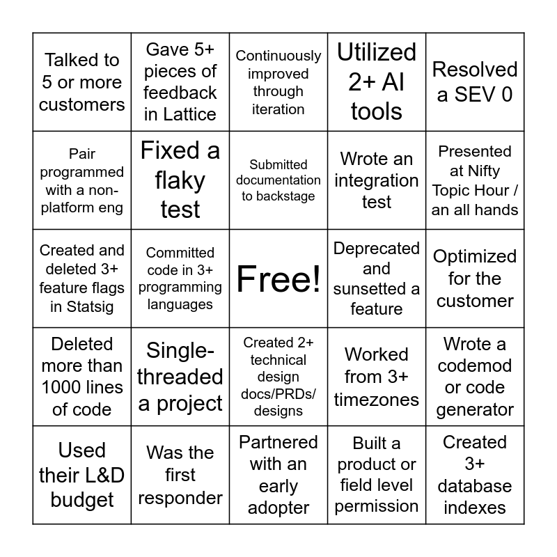 This bingo card has a free space and 24 words: Single-threaded a project, Was the first responder, Submitted documentation to backstage, Used their L&D budget, Resolved a SEV 0, Talked to 5 or more customers, Pair programmed with a non-platform eng, Gave 5+ pieces of feedback in Lattice, Deprecated and sunsetted a feature, Created 2+ technical design docs/PRDs/ designs, Wrote an integration test, Created and deleted 3+ feature flags in Statsig, Worked from 3+ timezones, Wrote a codemod or code generator, Fixed a flaky test, Built a product or field level permission, Optimized for the customer, Continuously improved through iteration, Presented at Nifty Topic Hour / an all hands, Committed code in 3+ programming languages, Created 3+ database indexes, Deleted more than 1000 lines of code, Utilized 2+ AI tools and Partnered with an early adopter.