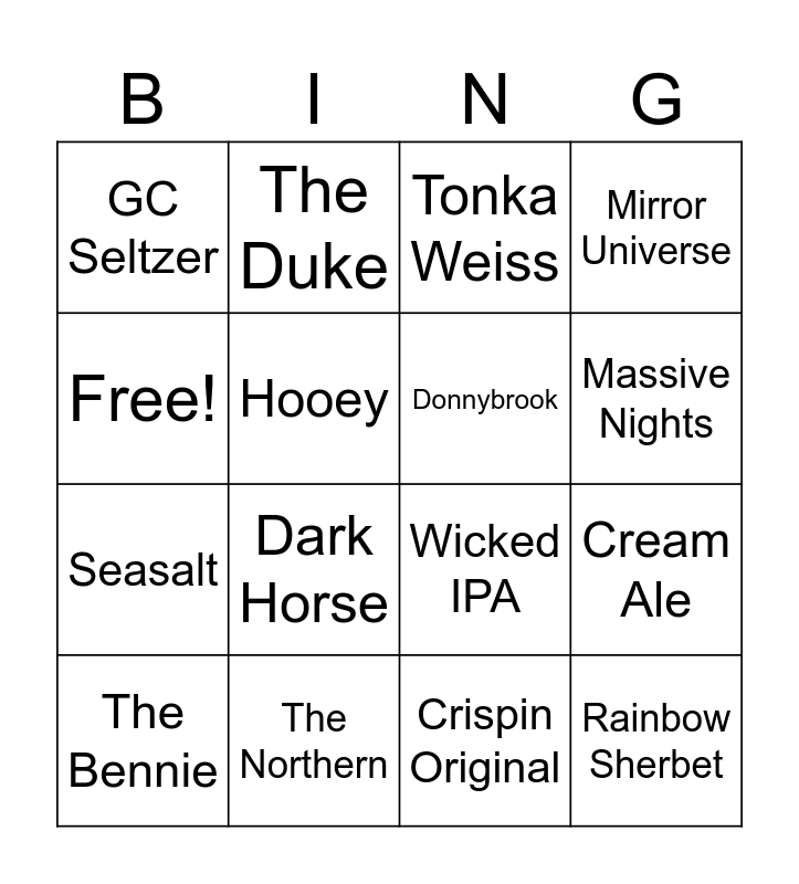 This bingo card has 16 words: The Northern, Cream Ale, Tonka Weiss, GC Seltzer, Seasalt, The Duke, Wicked IPA, Crispin Original, Free!, Hooey, The Bennie, Mirror Universe, Dark Horse, Massive Nights, Donnybrook and Rainbow Sherbet.