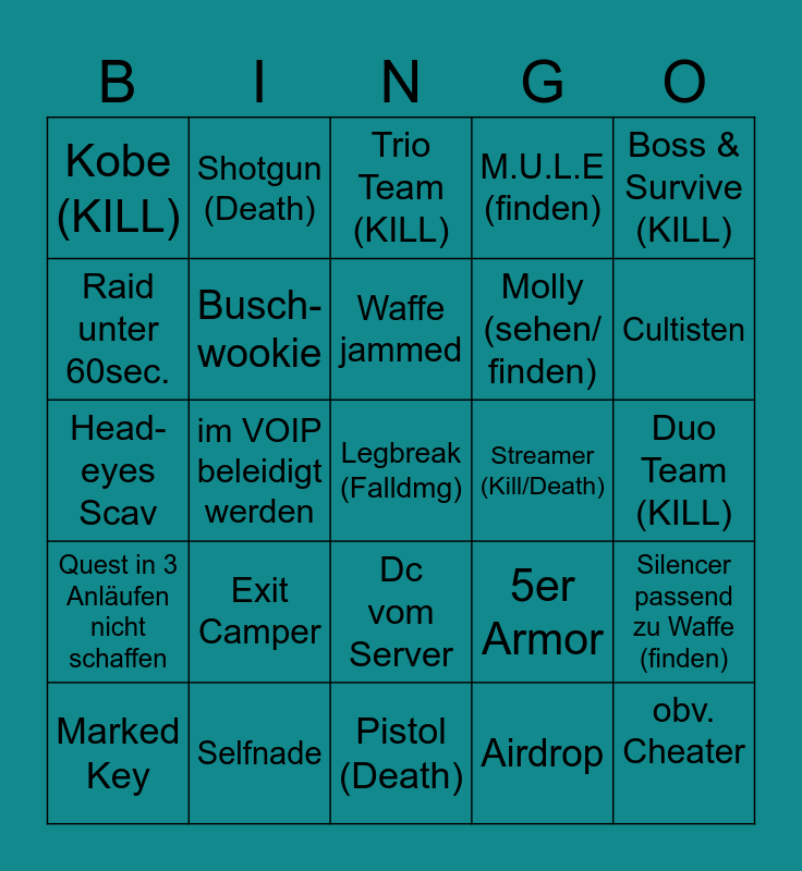 This bingo card has a free space and 24 words: Exit Camper, Selfnade, Waffe jammed, Marked Key, Boss & Survive (KILL), Kobe (KILL), Raid unter 60sec., Shotgun (Death), Streamer (Kill/Death), Dc vom Server, Molly (sehen/ finden), Head-eyes Scav, 5er Armor, Silencer passend zu Waffe (finden), Busch- wookie, Airdrop, Duo Team (KILL), Trio Team (KILL), Cultisten, im VOIP beleidigt werden, obv. Cheater, Quest in 3 Anläufen nicht schaffen, M.U.L.E (finden) and Pistol (Death).