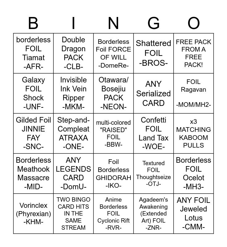 This bingo card has a free space and 24 words: Vorinclex (Phyrexian) -KHM-, ANY LEGENDS CARD -DomU-, Otawara/ Bosejiu PACK -NEON-, Agadeem's Awakening (Extended Art) FOIL -ZNR-, FREE PACK FROM A FREE PACK!, borderless FOIL Tiamat -AFR-, Double Dragon PACK -CLB-, Borderless Foil FORCE OF WILL -DomeRe-, Confetti FOIL Land Tax -WOE-, x3 MATCHING KABOOM PULLS, Gilded Foil JINNIE FAY -SNC-, Invisible Ink Vein Ripper -MKM-, Textured FOIL Thoughtseize -OTJ-, Borderless FOIL Ocelot -MH3-, Galaxy FOIL Shock -UNF-, TWO BINGO CARD HITS IN THE SAME STREAM, Anime Borderless FOIL Cyclonic Rift -RVR-, Shattered FOIL -BROS-, FOIL Ragavan -MOM/MH2-, Borderless Meathook Massacre -MID-, Step-and-Compleat ATRAXA -ONE-, Foil Borderless GHIDORAH -IKO-, ANY Serialized CARD and ANY FOIL Jeweled Lotus -CMM-.