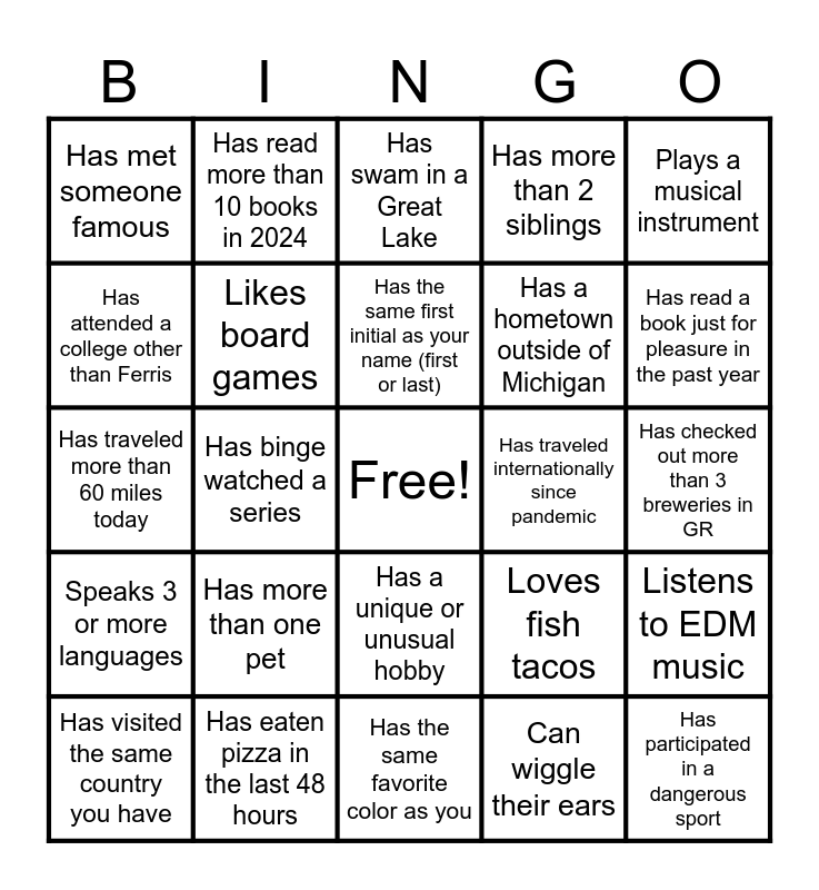 This bingo card has a free space and 25 words: Has more than one pet, Has the same favorite color as you, Has the same first initial as your name (first or last), Has visited the same country you have, Plays a musical instrument, Has met someone famous, Has attended a college other than Ferris, Has read more than 10 books in 2024, Has traveled internationally since pandemic, Has a unique or unusual hobby, Has a hometown outside of Michigan, Has traveled more than 60 miles today, Loves fish tacos, Listens to EDM music, Likes board games, Has visited Frankenmuth, Has checked out more than 3 breweries in GR, Has swam in a Great Lake, Has read a book just for pleasure in the past year, Has binge watched a series, Has participated in a dangerous sport, Has eaten pizza in the last 48 hours, Speaks 3 or more languages, Has more than 2 siblings and Can wiggle their ears.