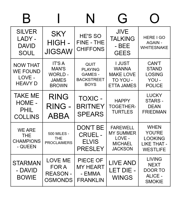 This bingo card has 50 words: BROTHER LOUIS - MODERN TALKING, TOXIC - BRITNEY SPEARS, A NIGHT TO REMEMBER - SHALAMER, PIECE OF MY HEART - EMMA FRANKLIN, 500 MILES - THE PROCLAIMERS, ON MY OWN - PATTI LaBELLE, SKY HIGH - JIGSAW, SEA OF LOVE - HONEYDRIPPERS, NOW THAT WE FOUND LOVE - HEAVY D, TEDDY SWIMS - DEVIL IN THE DRESS, IT'S A MAN'S WORLD - JAMES BROWN, JIVE TALKING - BEE GEES, WHEN YOU'RE LOOKING LIKE THAT - WESTLIFE, FAREWELL MY SUMMER LOVE - MICHAEL JACKSON, WHATS IN A KISS - GILBERT O'SULLIVAN, THE GAME OF LOVE - WAYNE FONTANA, QUIT PLAYING GAMES - BACKSTREET BOYS, HAPPY TOGETHER- TURTLES, LADY LOVE ME - GEORGE BENSON, HERE I GO AGAIN - WHITESNAKE, RING RING - ABBA, LIVE AND LET DIE - WINGS, SILVER LADY - DAVID SOUL, I JUST WANNA MAKE LOVE TO YOU - ETTA JAMES, ANTMUSIC - ADAM & THE ANTS, LIVING NEXT DOOR TO ALICE - SMOKIE, CAN'T STAND LOSING YOU - POLICE, YOU AIN'T SEEN NOTHING YET - BACKMAN TURNER, HE'S SO FINE - THE CHIFFONS, DON'T BE CRUEL - ELVIS PRESLEY, I GUESS THAT'S WHY THEY CALL IT THE BLUES - ELTON JOHN, BABY I WANT YOU - BREAD, TIE A YELLOW RIBBON - DAWN, MANEATER - HALL & OATES, LOVE ME FOR A REASON -OSMONDS, WE LIKE TO PARTY - VENGABOYS, EVERY TIME YOU GO AWAY - PAUL YOUNG, ADDICTED TO LOVE - ROBERT PALMER, RHYTHM IS A DANCER - SNAP, LUCKY STARS - DEAN FRIEDMAN, LIVING ON A PRAYER - BON JOVI, DREAMING - CLIFF RICHARD, HE'S THE GREATEST DANCER - SISTER SLEDGE, BABE - STYX, STARMAN - DAVID BOWIE, TAKE ME HOME - PHIL COLLINS, TRACKS OF MY TEARS - SMOKEY ROBINSON, WOMAN IN LOVE - THREE DEGREES, WE ARE THE CHAMPIONS - QUEEN and FAMILY AFFAIR - MARY J.