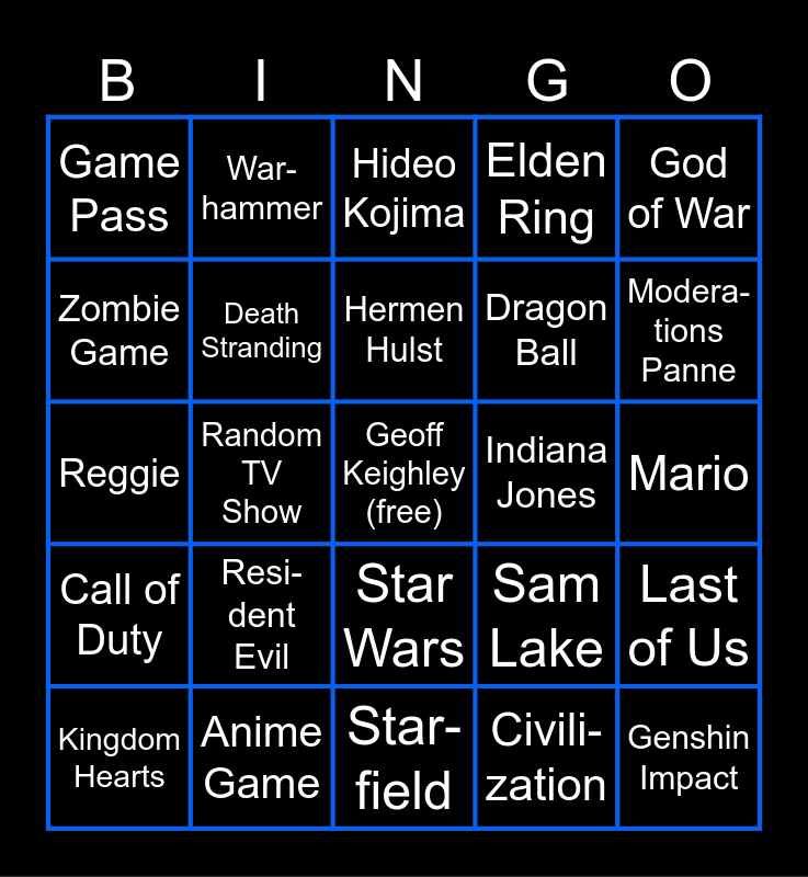 This bingo card has a free space and 58 words: Assassin's Creed, Anime Game, Bat- man, Call of Duty, Civili-zation, Cloud Gaming, Death Stranding, Diablo, Dragon Ball, Dune, Elden Ring, Film- Trailer, Final Fantasy, Flute Guy, Fortnite, Game Pass, Genshin Impact, God of War, GTA, Hermen Hulst, Indiana Jones, Hideo Kojima, Kingdom Hearts, Last of Us, Little Night-mares, Mario, Miss-lungener Scherz, Mobile Game, Modera-tions Panne, Monster Hunter, Musik Perfor-mance, Net-flix, One More Thing, Phil Spencer, Pixel Art, Random Celebrity, Random Movie, Random TV Show, Reggie, Remake/ -master, Resi-dent Evil, RTX, Sam Lake, Silent Hill, Sonic, Souls- like, Spider-Man, Star Wars, Star-field, Tech-nische Probleme, Todd Howard, Über-setzer dabei, Ubisoft Open World, VR, War-hammer, World Pre-miere, Zombie Game and Zuschauer stürmt Bühne.
