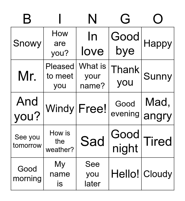This bingo card has a free space and 24 words: How is the weather?, My name is, What is your name?, Good morning, Happy, Snowy, Mr., How are you?, Good evening, Sad, Thank you, And you?, Good night, Tired, Pleased to meet you, Hello!, Mad, angry, In love, Sunny, Windy, Cloudy, See you tomorrow, Good bye and See you later.