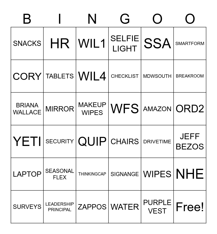 This bingo card has 42 words: PURPLE VEST, TABLETS, PECCY, AMAZON, JEFF BEZOS, SECURITY, BRIANA WALLACE, DRUG TEST, WIL1, ORD2, MAKEUP WIPES, CHECKLIST, BREAKROOM, SSA, LEADERSHIP PRINCIPAL, YETI, NHE, MDWSOUTH, Free!, HR, SMARTFORM, THINKINGCAP, LAPTOP, SNACKS, CANDIATE PARKING, SURVEYS, WIL4, REFFERAL CARDS, SEASONAL FLEX, WIPES, IGQ1, WFS, CORY, DRIVETIME, ZAPPOS, QUIP, CHAIRS, MIRROR, SIGNANGE, WATER, SELFIE LIGHT and BADGE.