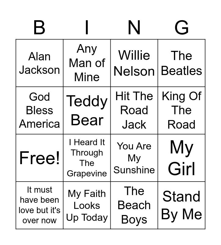 This bingo card has 20 words: My Girl, Ring Of Fire, Willie Nelson, Jolene, It must have been love but it's over now, God Bless America, My Faith Looks Up Today, Alan Jackson, Free!, Any Man of Mine, I Heard It Through The Grapevine, You Are My Sunshine, Teddy Bear, Stand By Me, Hit The Road Jack, Pretty Women, King Of The Road, The Beatles, The Beach Boys and George Straight.