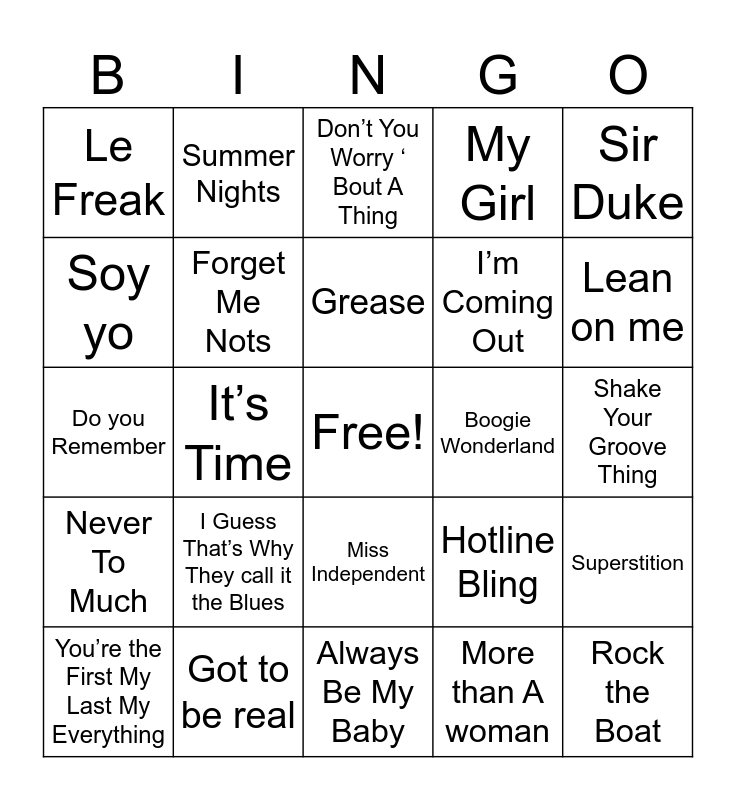 This bingo card has a free space and 58 words: Birds of a feather, Got to be real, Made for Me, Never To Much, More than A woman, Rock With You, Forget Me Nots, Best Of My Love, I’m Coming Out, P.Y.T, My Girl, Signed Sealed Delivered, Night Fever, For Once In My Life, Baby Come Back, Le Freak, Rock the Boat, Sir Duke, You Should be Dancing, Grease, Boogie Wonderland, Don’t You Worry ‘ Bout A Thing, You’re the First My Last My Everything, Superstition, Shining Star, Shake Your Groove Thing, Get Up Offa That Thing, The Way you make me feel, Lean on me, Hot Stuff, ABC, Kung Fu Fighting, I can See clearly now, She’s A Bad Mama Jama, Think, Unwritten, Forget you, It’s Time, Do you Remember, You Can Call me Al, I Guess That’s Why They call it the Blues, Waterfall, Hotline Bling, Hips Don’t Lie, Bennie and The Jets, The Tide is High, Circles, Miss Independent, Always Be My Baby, Butter, Calm Down, Don’t worry be happy, Break My Stride, Go Your own way, Summer Nights, SOS, Soy yo and Say My name.