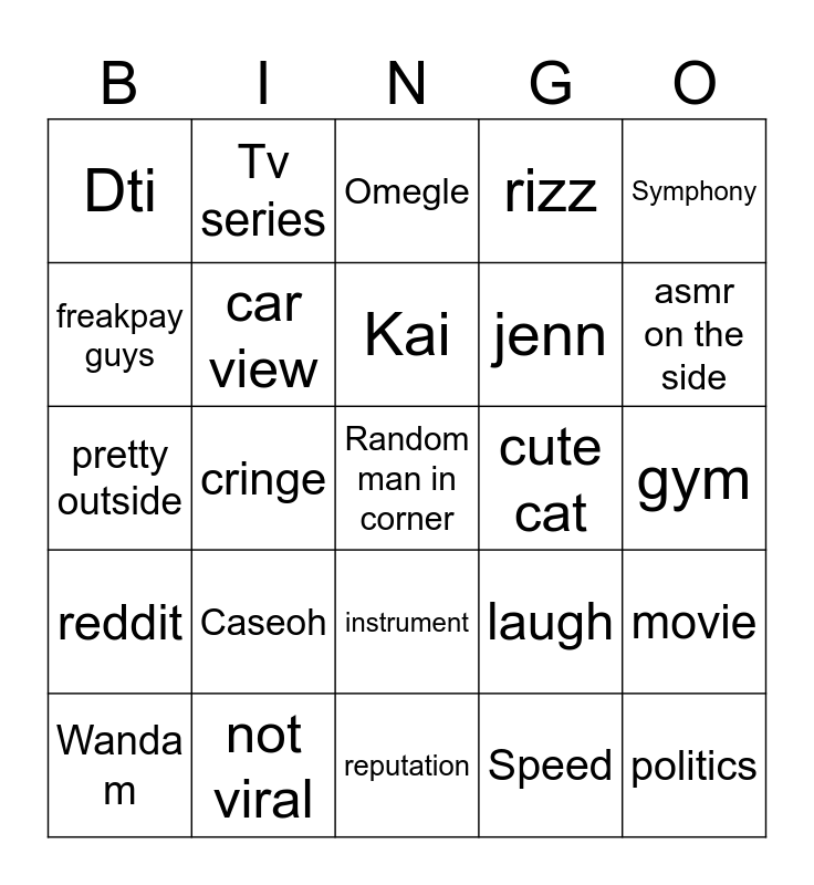 This bingo card has a free space and 24 words: Wanda m, Caseoh, Kai, Speed, Symphony, Dti, Tv series, Omegle, cute cat, gym, pretty outside, car view, laugh, movie, freakpay guys, not viral, reputation, rizz, asmr on the side, reddit, cringe, instrument, jenn and politics.