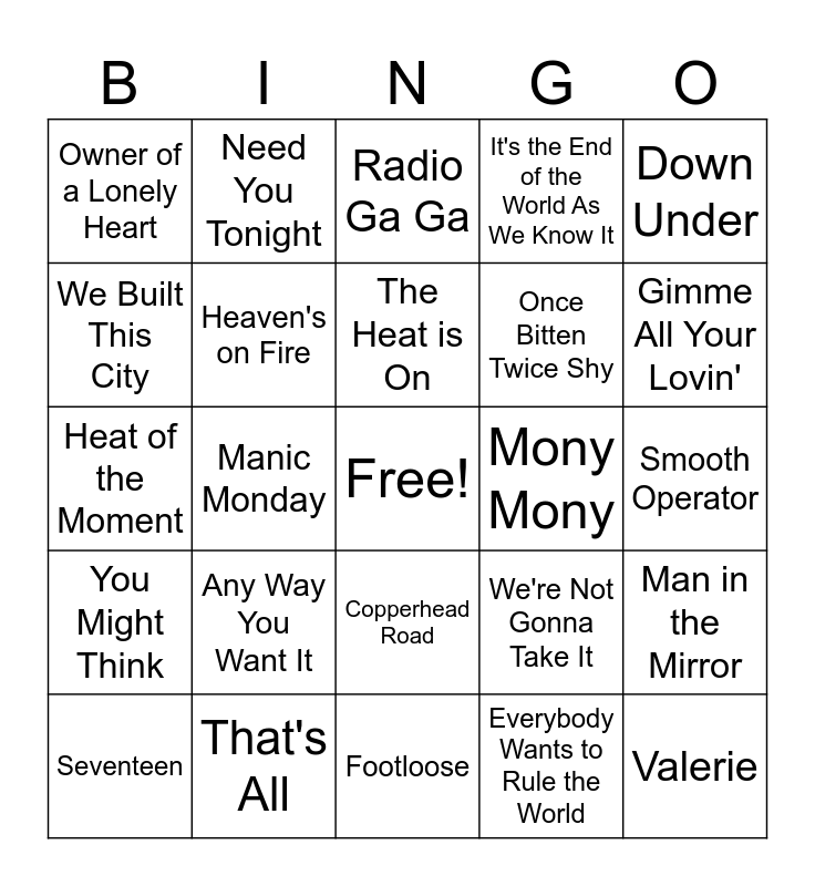 This bingo card has a free space and 56 words: You Can Call Me Al, Seventeen, Kickstart My Heart, Owner of a Lonely Heart, Footloose, Centerfield, Heaven's on Fire, Hurts so Good, Once Bitten Twice Shy, Just Can't Get Enough, It's the End of the World As We Know It, Don't Dream It's Over, Dancing on the Ceiling, Lay It Down, Eighteen Wheels and a Dozen Roses, Rainbow in the Dark, Down Under, Manic Monday, Waiting for a Star to Fall, Valerie, Mony Mony, All My Ex's Live in Texas, We're Not Gonna Take It, Radio Ga Ga, The Best, The Heat is On, Panama, Money for Nothing, Gimme All Your Lovin', Here I Go Again, Never Gonna Give You Up, Broken Wings, Take My Breath Away, Modern Day Cowboy, Smooth Operator, We Built This City, Heat of the Moment, Wanted Dead or Alive, You Might Think, Need You Tonight, Copperhead Road, On the Road Again, Dude (Looks Like a Lady), (I Just) Died in Your Arms, I Should Be So Lucky, Any Way You Want It, That's All, I Won't Back Down, Mama He's Crazy, Sledgehammer, Everybody Wants to Rule the World, Kids in America, Talk Dirty to Me, Maneater, Man in the Mirror and Total Eclipse of the Heart.
