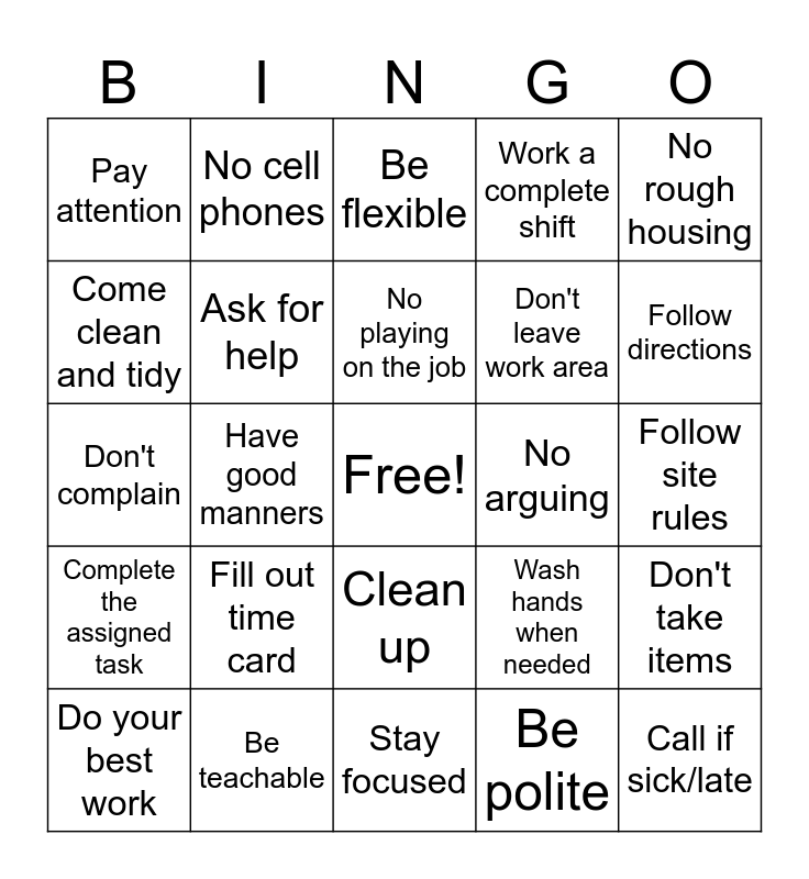 This bingo card has a free space and 30 words: Be teachable, Wear appropriate gear, Have good manners, Keep a Positive attitude, Pay attention, Be flexible, Ask for help, Clean up, No arguing, Stay focused, Follow site rules, Call if sick/late, Be polite, Be on time, Follow directions, Monitor you own behavior, Wash hands when needed, Complete the assigned task, Fill out time card, No rough housing, Don't complain, Use proper language, No cell phones, Don't leave work area, Come clean and tidy, Work a complete shift, Don't take items, Do your best work, No playing on the job and Use proper tools.