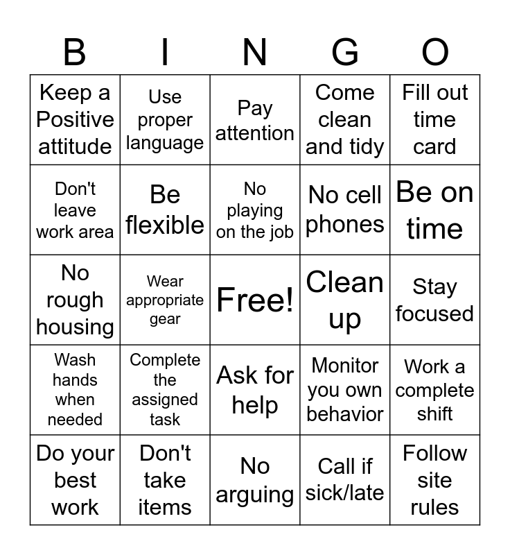 This bingo card has a free space and 30 words: Don't take items, Be teachable, Wear appropriate gear, Have good manners, Keep a Positive attitude, Pay attention, Be flexible, Ask for help, Clean up, No arguing, Stay focused, Follow site rules, Call if sick/late, Be polite, Be on time, Follow directions, Monitor you own behavior, Wash hands when needed, Complete the assigned task, Fill out time card, No rough housing, Don't complain, Use proper language, No cell phones, Don't leave work area, Come clean and tidy, Work a complete shift, Do your best work, No playing on the job and Use proper tools.