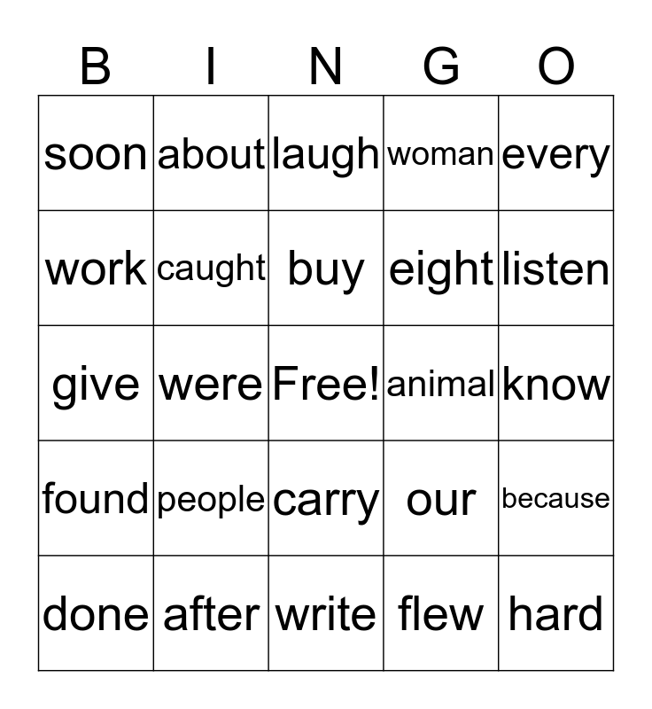 This bingo card has a free space and 24 words: people, after, buy, done, every, soon, work, about, animal, carry, eight, give, our, because, caught, flew, know, laugh, listen, were, hard, found, woman and write.