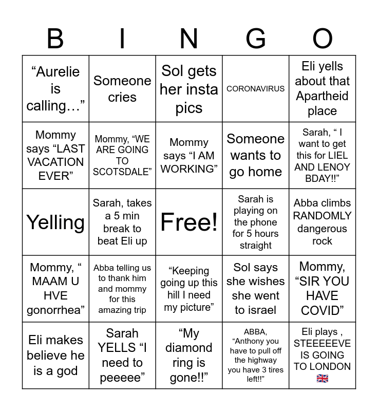 This bingo card has a free space and 24 words: Abba telling us to thank him and mommy for this amazing trip, Sarah YELLS “I need to peeeee”, Mommy says “I AM WORKING”, Eli makes believe he is a god, Eli yells about that Apartheid place, “Aurelie is calling…”, Mommy says “LAST VACATION EVER”, Someone cries, Sarah is playing on the phone for 5 hours straight, “Keeping going up this hill I need my picture”, Someone wants to go home, Yelling, Sol says she wishes she went to israel, Mommy, “SIR YOU HAVE COVID”, Mommy, “WE ARE GOING TO SCOTSDALE”, ABBA, “Anthony you have to pull off the highway you have 3 tires left!!”, Abba climbs RANDOMLY dangerous rock, Sol gets her insta pics, Sarah, “ I want to get this for LIEL AND LENOY BDAY!!”, Sarah, takes a 5 min break to beat Eli up, Eli plays , STEEEEEVE IS GOING TO LONDON 🇬🇧, Mommy, “ MAAM U HVE gonorrhea”, CORONAVIRUS and “My diamond ring is gone!!”.