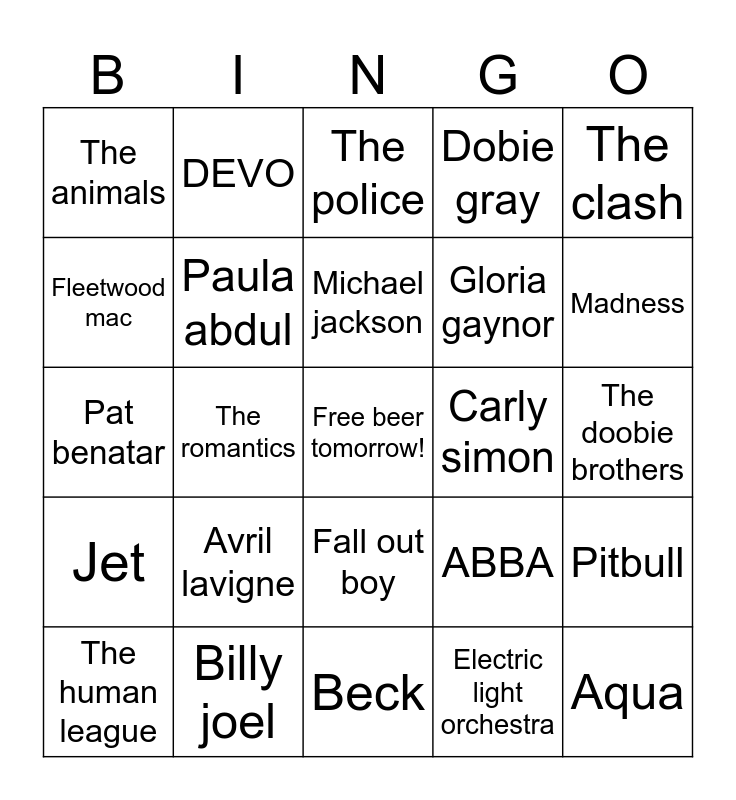 This bingo card has a free space and 45 words: Miley cyrus, Aqua, Backstreet boys, The human league, The beatles, Electric light orchestra, The police, Styx, The clash, Billy joel, Dobie gray, Carly simon, Fall out boy, Avril lavigne, Incubus, Beck, The cars, Pat benatar, Night ranger, Madness, DEVO, Run D.M.C., Justin bieber, The animals, Ben e. king, The doobie brothers, Linkin park, Men at work, ABBA, Jet, Fatboy slim, Pitbull, Hootie & the blowfish, Bob seger, Jimmy buffett, The romantics, Bruno mars, Paramore, Mariah carey, Michael jackson, Fleetwood mac, Gloria gaynor, Elton john, Paula abdul and The cure.