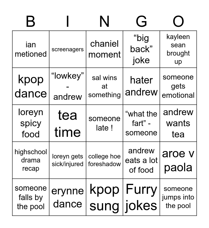 This bingo card has a free space and 25 words: loreyn gets sick/injured, kpop sung, sal wins at something, someone falls by the pool, kayleen sean brought up, ian metioned, kpop dance, screenagers, “what the fart” - someone, college hoe foreshadow, hater andrew, loreyn spicy food, andrew eats a lot of food, aroe v paola, “lowkey” - andrew, jaroe moment, andrew wants tea, chaniel moment, someone gets emotional, tea time, someone jumps into the pool, erynne dance, highschool drama recap, “big back” joke and Furry jokes.